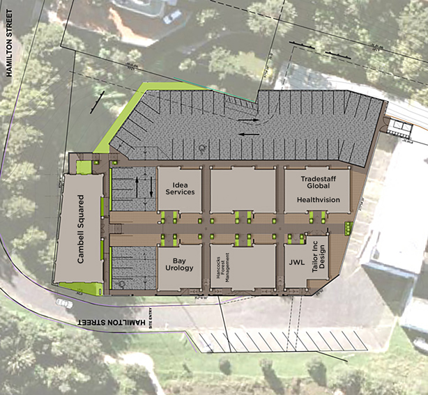 Nestled in it's own valley, centrally located and very accessible, but separated from the hustle and bustle of Tauranga central, it has been designed to provide a relaxing village style environment, where a group of small to medium sized, like minded businesses will develop a strong sense of business community. Pleasantly surrounded by plantings, the development looks across Tauranga harbour, to enjoy beautiful views and sunsets. Car parking has been deliberately locates to the rear of the site to allow the buildings themselves to be incorporated into the park like setting.